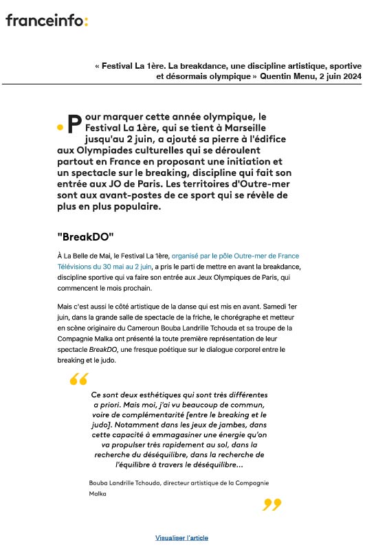 BreakDO is a choreographic project in which the art of breaking meets the art of judo, exploring their many commonalities. The dynamics, the flashes, the energy, the anchoring, the effort all contribute to the search for a certain harmony between body and head, mind and gesture. Based on these elements, and on the occasion of the appearance of breakdance at the Paris Olympics, this project by an ultra-marine team presents the infinite possibilities of this unprecedented dialogue.